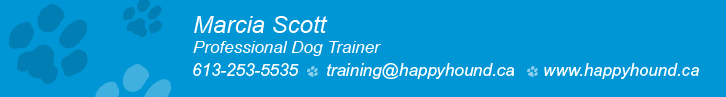 If you have any questions at all on these training tips then please send us an email to info@happyhound.ca or give Sue a call 613-899-2136 and we will walk you through the process to help with your success.